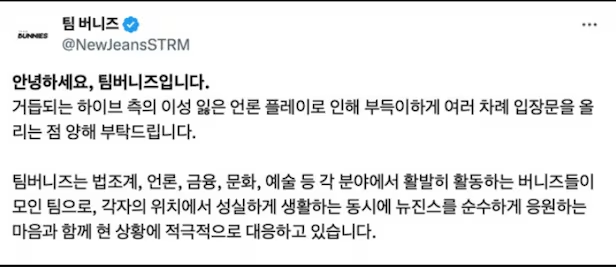Team Bunnies sendiri merupakan bagian dari kelompok penggemar girl group NewJeans yang aktif di platform X dan mengklaim bahwa mereka terdiri atas ahli di berbagai bidang seperti hukum, media, keuangan, serta budaya dan seni.