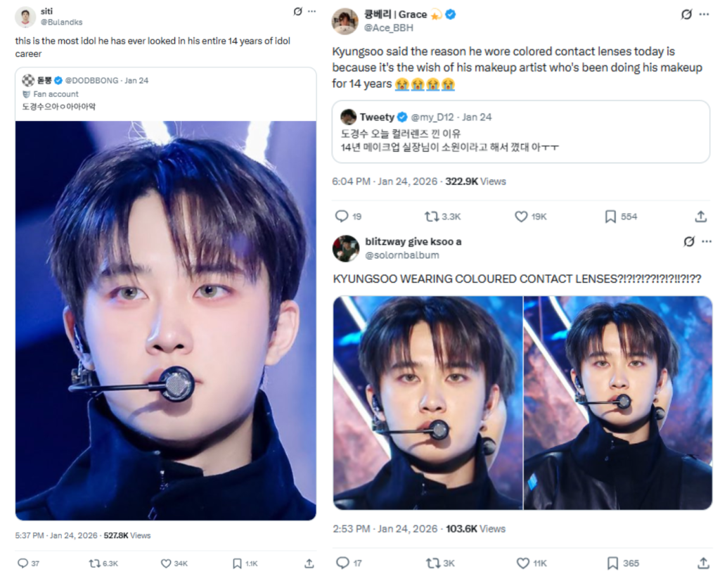 Bukan karena suara atau kemampuan menarinya, idol sekaligus aktor ini berhasil membuat penggemar salah fokus pasalnya ia tampil dengan lensa kontak berwarna untuk pertama kalinya sejak debut 14 tahun yang lalu. Penggemar mengaku bahwa penampilannya tersebut adalah penampilan “paling idol” selama ia berkarir.