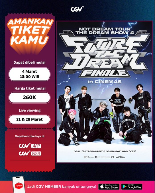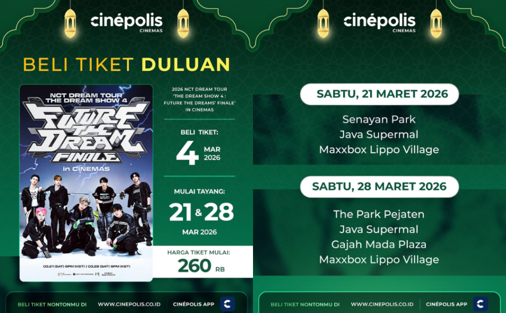 terkinni.id – Akan ditayangkan secara live di 86 kota seluruh dunia, termasuk Indonesia, pada 21 & 28 Maret mendatang, CGV dan Cinepolis Indonesia akhirnya mengumumkan waktu pembelian, lokasi, hingga harga tiket ‘NCT DREAM TOUR in CINEMAS’.