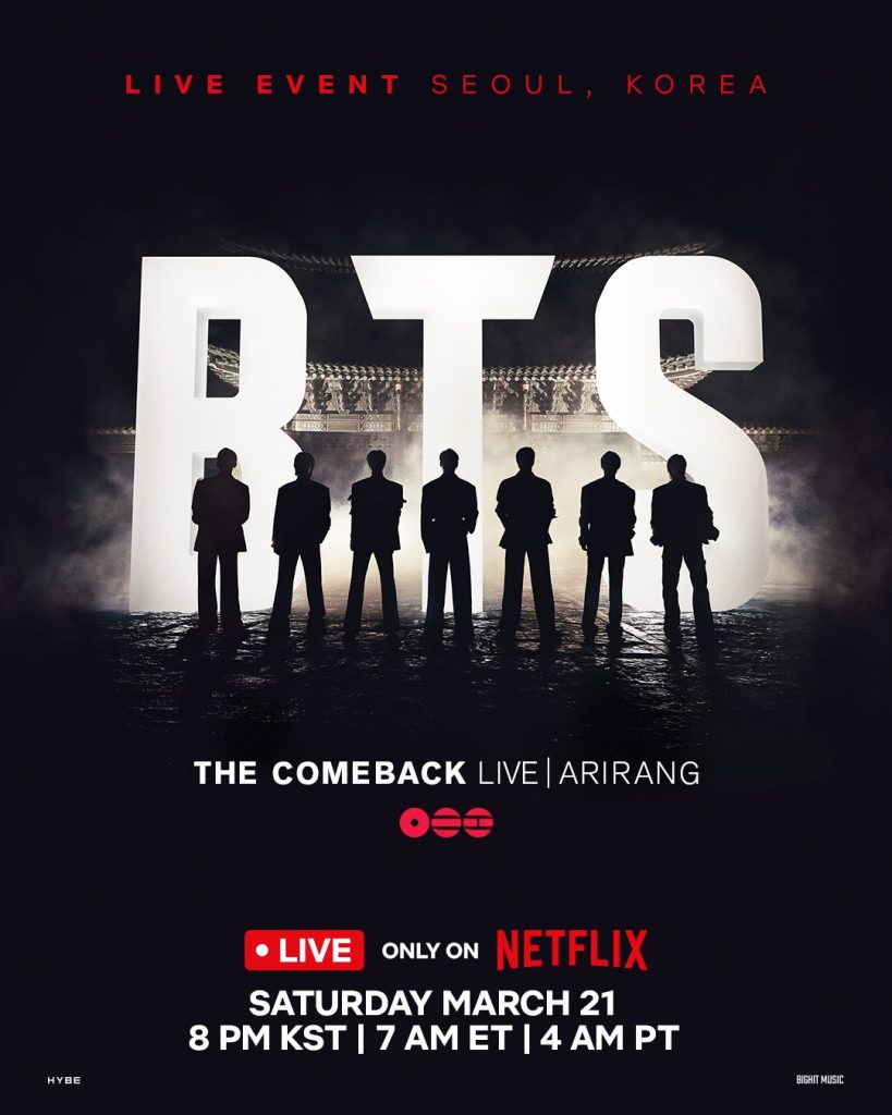 BTS sendiri dijadwalkan merilis comeback grup yang telah lama dinantikan pada 20 Maret. Sementara itu, acara “BTS THE COMEBACK LIVE: ARIRANG” akan disiarkan pada 21 Maret pukul 20.00 KST melalui Netflix.