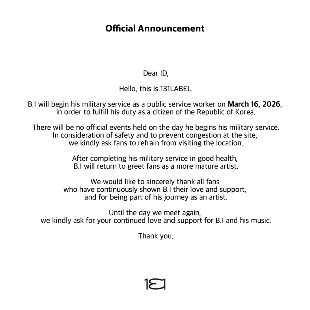 terkinni.id – Pada Selasa (10/3), 131LABEL mengumumkan bahwa B.I akan memulai wajib militernya pada 16 Maret mendatang. Sehubungan dengan ini, agensi kemudian menegaskan pula bahwa tidak akan ada acara resmi yang akan diadakan di hari keberangkatan sang artis.