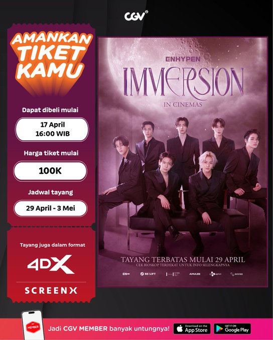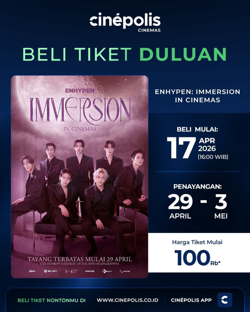 terkinni.id – Tayang secara terbatas mulai 29 April hingga 3 Mei mendatang, CGV dan Cinepolis Indonesia mengumumkan periode penjualan tiket “ENHYPEN: IMMERSION IN CINEMAS” akan dimulai pada 17 April 2026 pukul 16.00 WIB melalui aplikasi dan website resmi mereka.